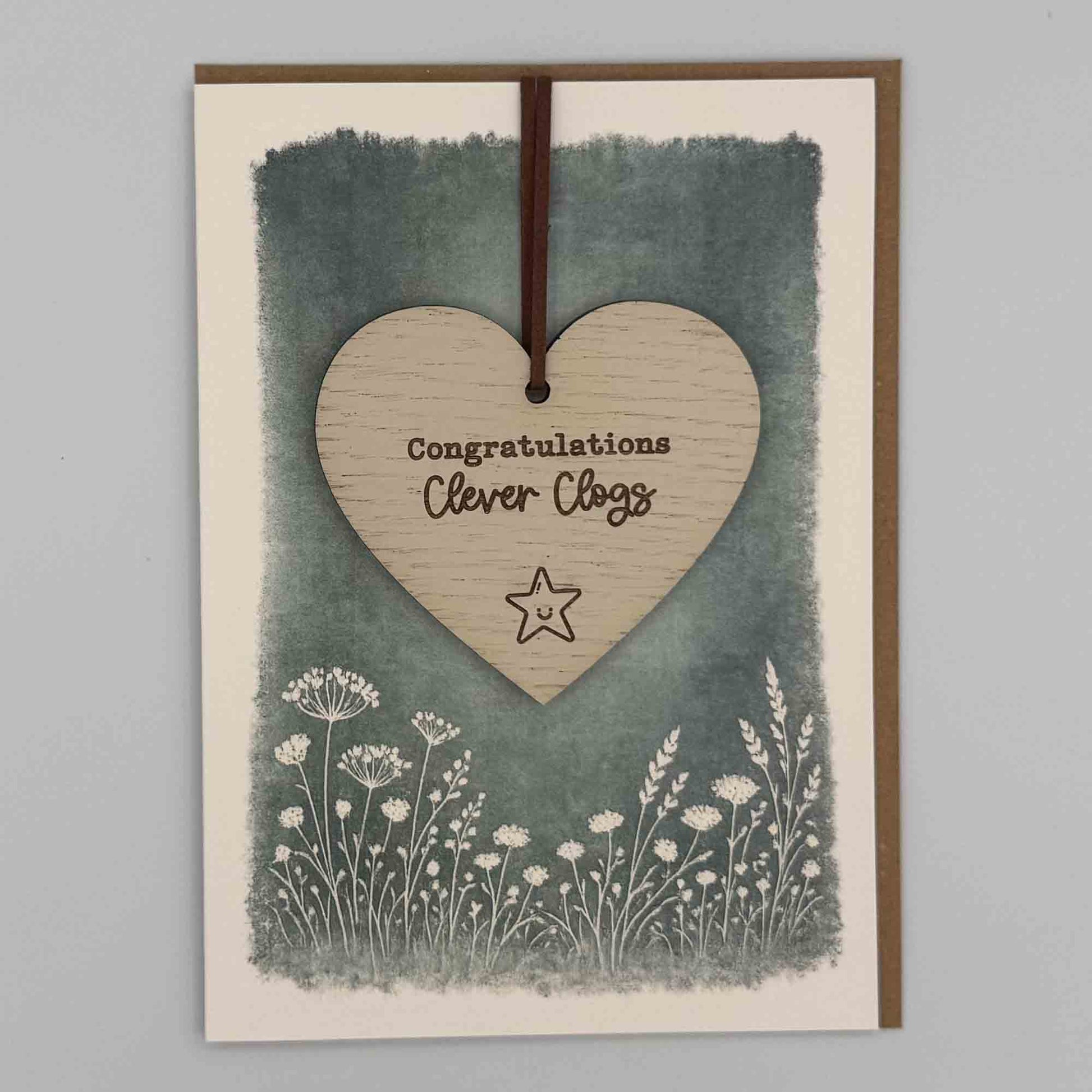 This folded 7x5 inch card features a removable oak heart keepsake, engraved with “Congratulations Clever Clogs” and finished with a subtle star detail. It offers customers a meaningful alternative to a standard greeting card, combining a heartfelt message with a lasting keepsake.