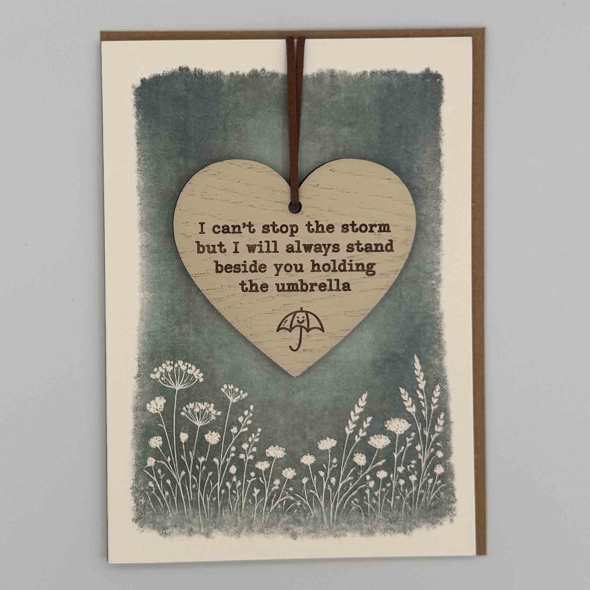 This folded 7x5 inch card features a removable oak heart keepsake, engraved with “I can't stop the storm but I will always stand beside you holding the umbrella” and finished with a subtle umbrella detail. It offers customers a meaningful alternative to a standard greeting card, combining a heartfelt message with a lasting keepsake.