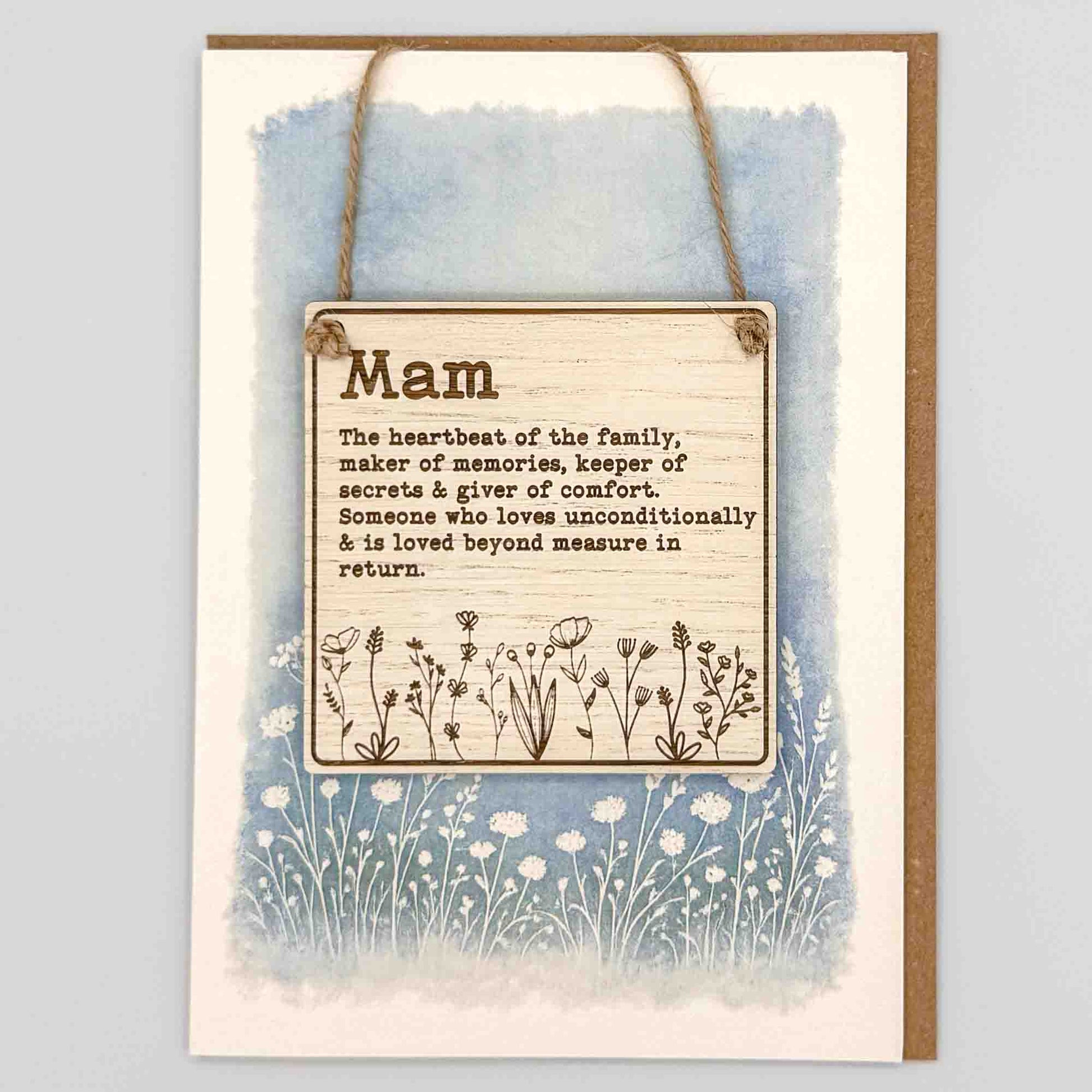 This folded 7x5 inch card features a removable oak square keepsake, engraved with “Mam The heartbeat of the family, maker of memories, keeper of secrets & giver of comfort. Someone who loves unconditionally & is loved beyond measure in return.". It offers customers a meaningful alternative to a standard greeting card, combining a heartfelt message with a lasting keepsake.