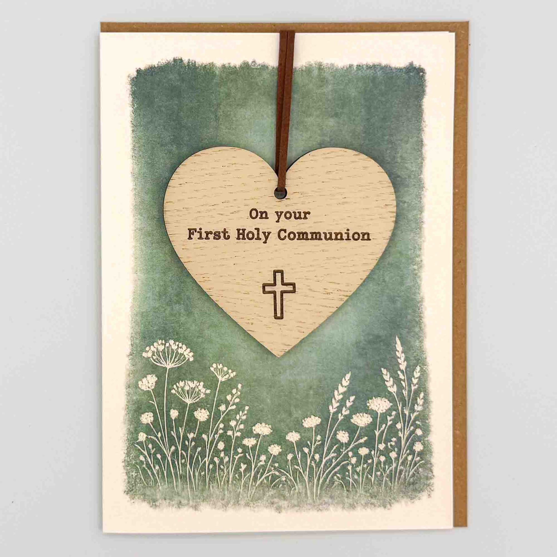 This folded 7x5 inch card features a removable oak heart keepsake, engraved with “On your First Holy Communion” and finished with a subtle cross detail. It offers customers a meaningful alternative to a standard greeting card, combining a heartfelt message with a lasting keepsake.