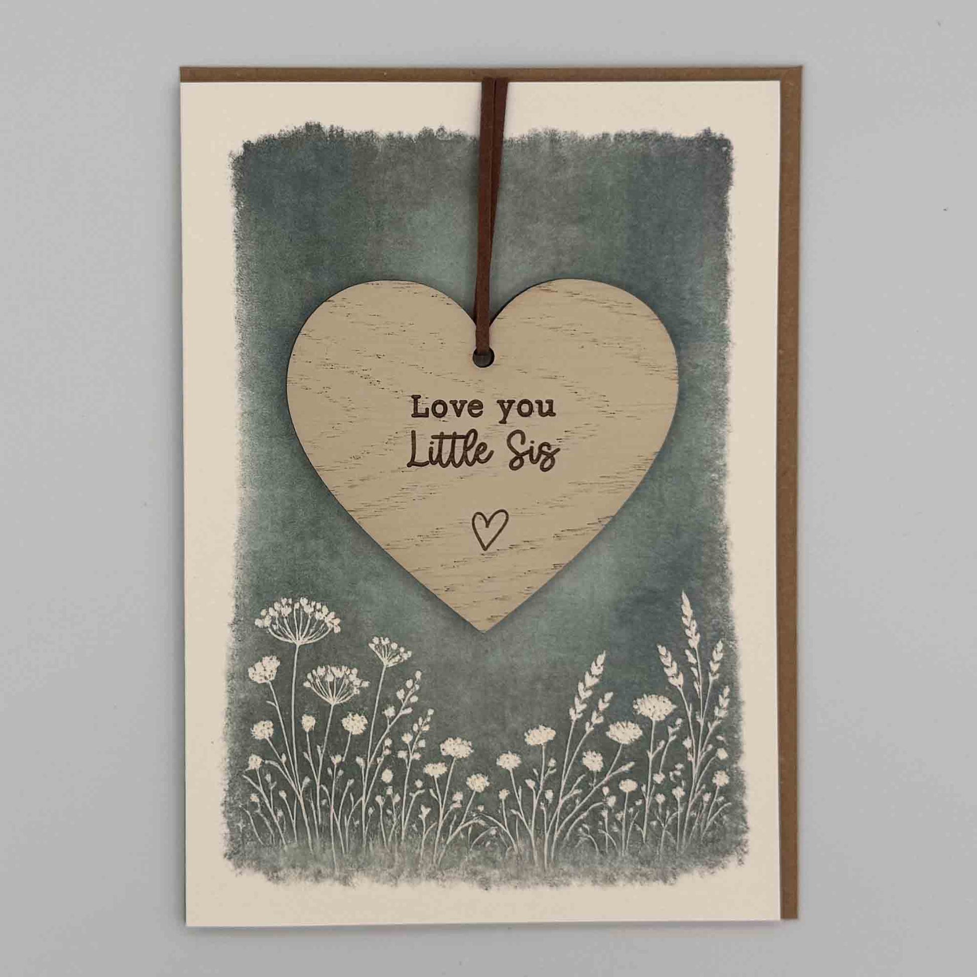 This folded 7x5 inch card features a removable oak heart keepsake, engraved with “Love you Little Sis” and finished with a subtle heart detail. It offers customers a meaningful alternative to a standard greeting card, combining a heartfelt message with a lasting keepsake.